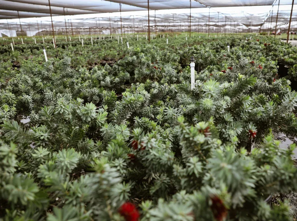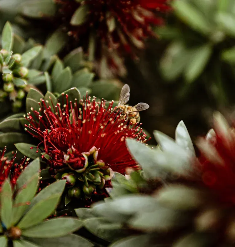 Flower: Bright red, fuzzy flowers (resemble pom-poms)