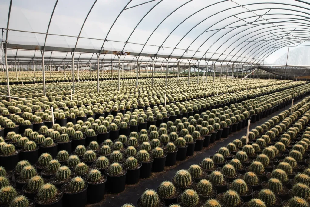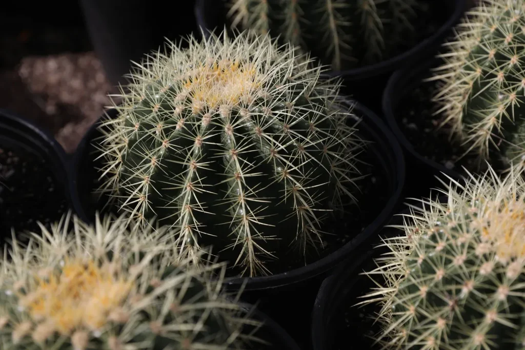 Echinocactus grusonii is a uniquely beautiful cacti that could originally be found in Central Mexico in the Rio Moctezuma Valley, Queretaro. Although widely distributed, the overcollection of fully mature E. grusonii has led to its near extinction in its own native habitat. To fix this, they are now homed in the Mexican Botanical Gardens where they allow nurseries to still use for propagation/ cloning purposes. E. grusonii, despite being an extremely slow grower, reaches a mature size of 2-3’ tall and wide and is often found growing in clusters. This pale green barrel is ribbed with several areoles (growth point for spikes) that produce 4” long yellow/golden spikes. Often times you will see the clusters of golden barrels facing S/SE in order to protect its areoles.