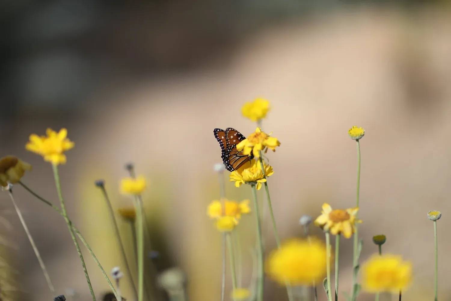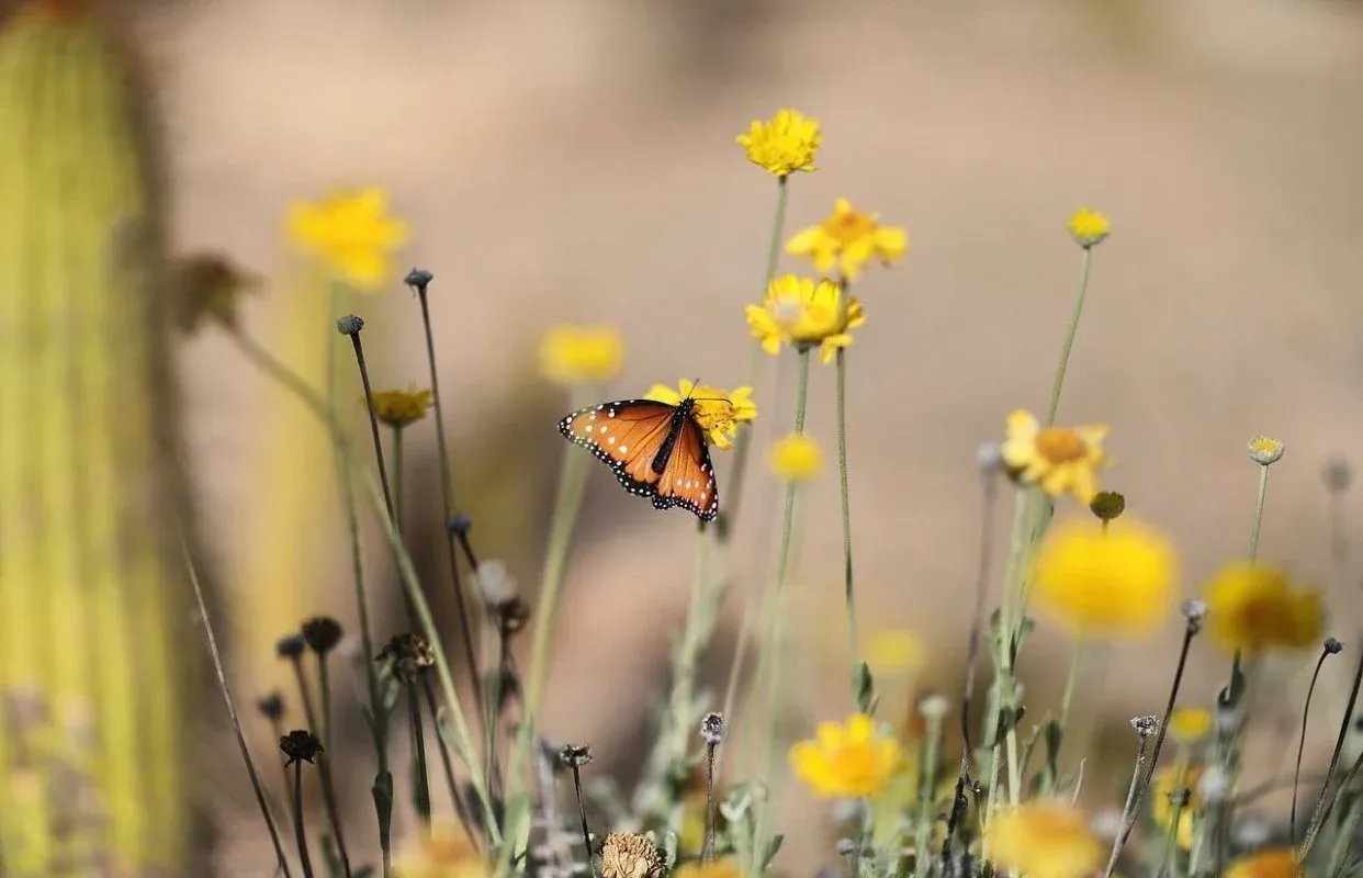 Native to the Sonoran Desert, Hymenoxys acaulis (Angelita Daisy) is a highly adaptable variety that thrives in both the harsh summer temperatures and cold winter nights. Surviving only off the rainfall that occurs naturally in this desert biome, they can tolerate anything from months of arid, moisture-deprived soils to the flash flooding brought on by monsoon season. Characteristic for their long, generous stems and sunflower-esque blooms, they flower consistently throughout the year and, like many desert species, grow south-facing to bask in our ample sunlight.