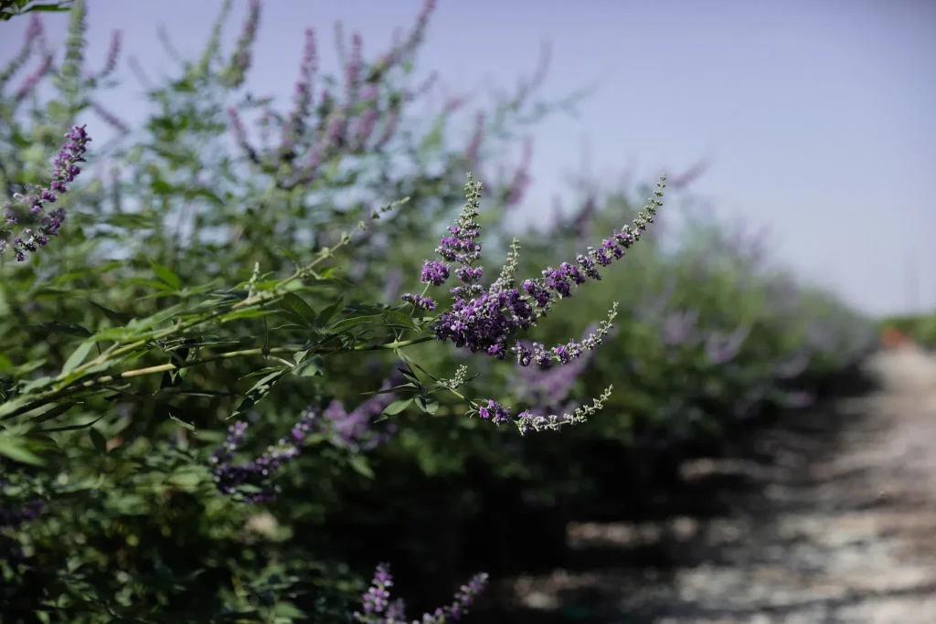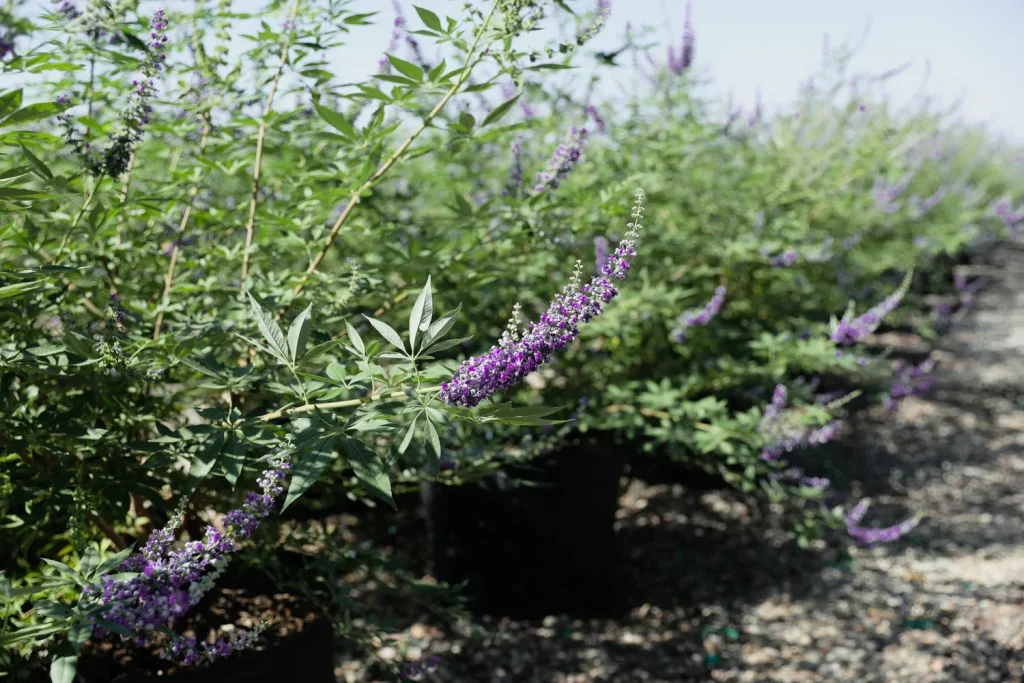 Vitex agnus-castus, commonly called chaste tree, is typically grown in warm climates as a deciduous multi-stemmed shrub reaching 10 to 15 feet tall or trained as a single trunk tree to reach closer to 20 feet. Features grayish-green compound leaves with 5-7 lance-shaped leaflets (each leaflet 6″ long) and tiny, fragrant, pale violet flowers appearing in loose panicles in mid to late summer. Because flowering appears on new growth, winter dieback or pruning will not affect flowering. This species also produces a fruit known as the chasteberry and has been used as an herbal remedy for centuries. Propagation of chaste tree is taken from cuttings in summer or early winter and best grown in loose, medium moisture, well-drained alkaline soil in full sun or partial shade.