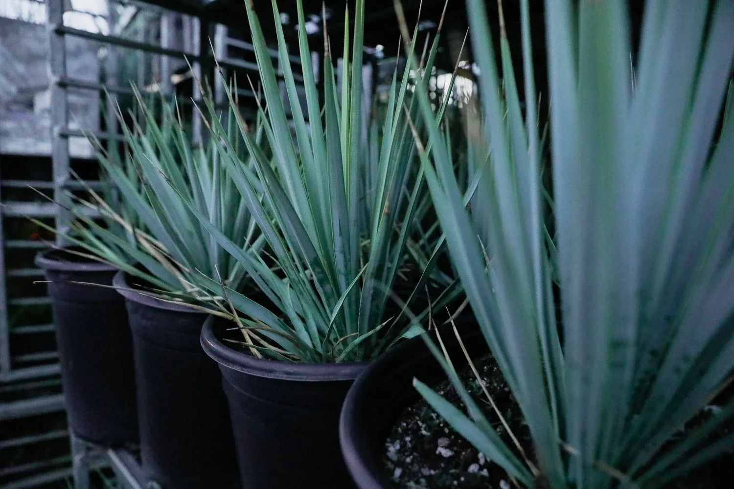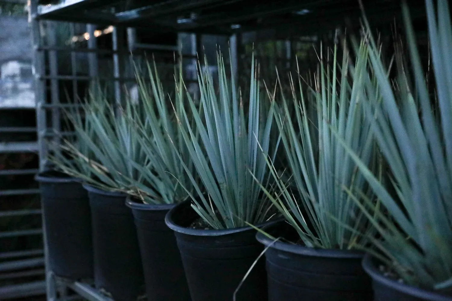 Yucca rigida, also known as the Mexican Blue Yucca, is a drought-tolerant, evergreen shrub or small tree that is native to Chihuahuan Desert in Northern Mexico. This powder blue yucca is perfect for large low water use landscapes. As the older foliage on this plant dies, it lays flat against the trunk of the plant, forming a thick thatch that is also called a skirt. Like most yuccas, its flowers attract insects such as butterflies and moths.